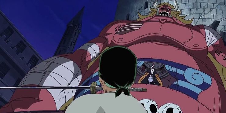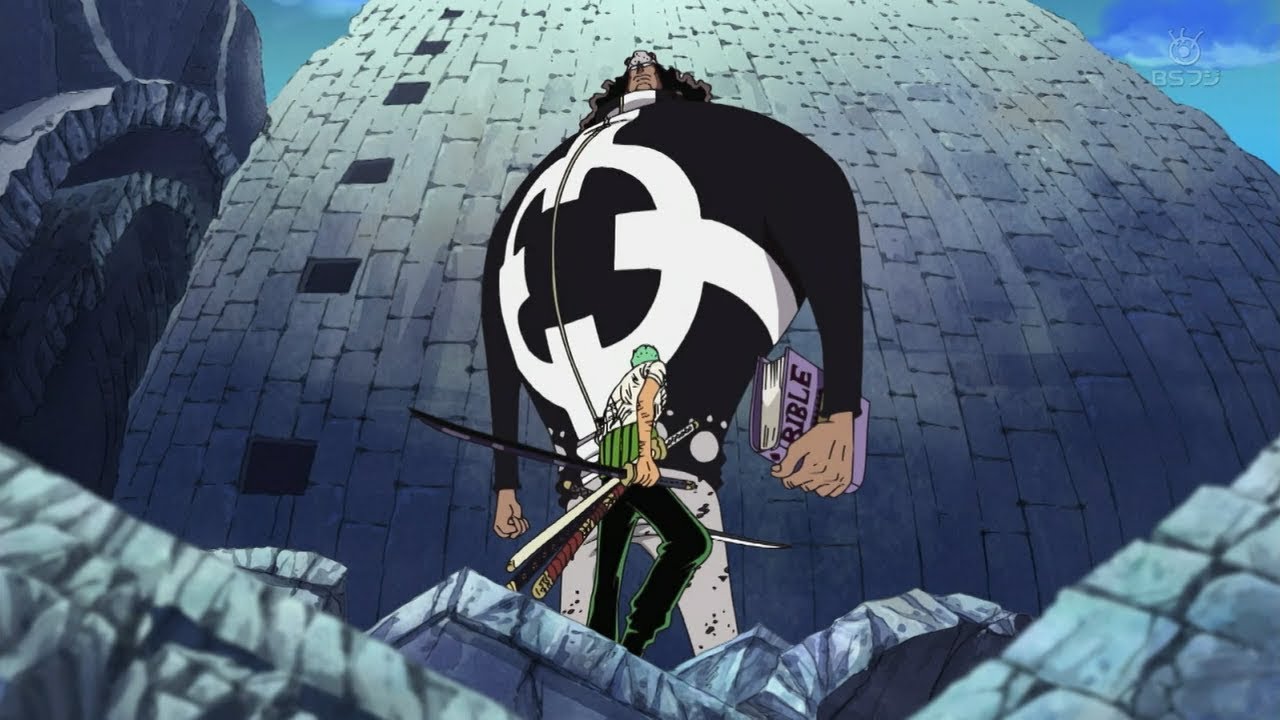 Karena tubuh raksasanya, satu jentikan jari tengah saja mampu membuat manusia melayang jauh, apalagi ditendang dengan begitu hebatnya? Tapi tidak berlaku untuk Zoro.